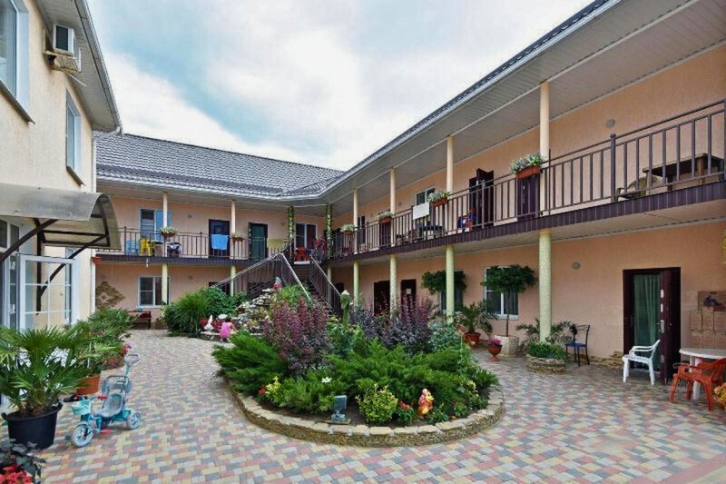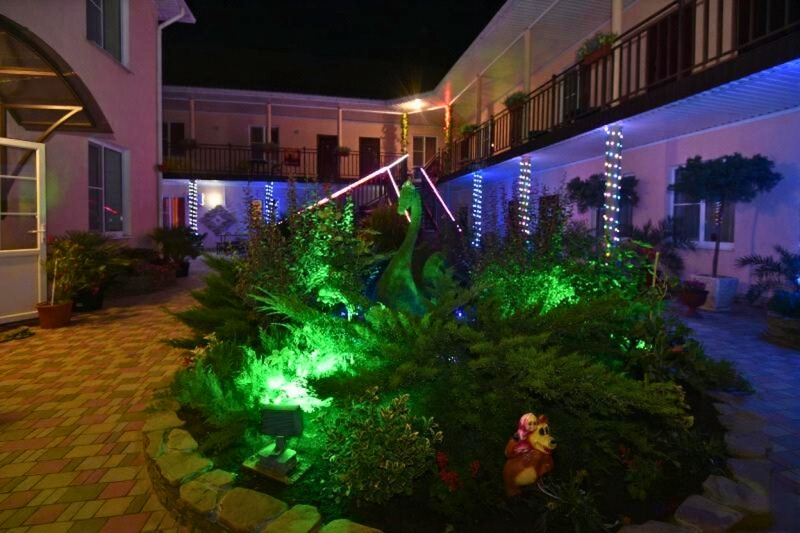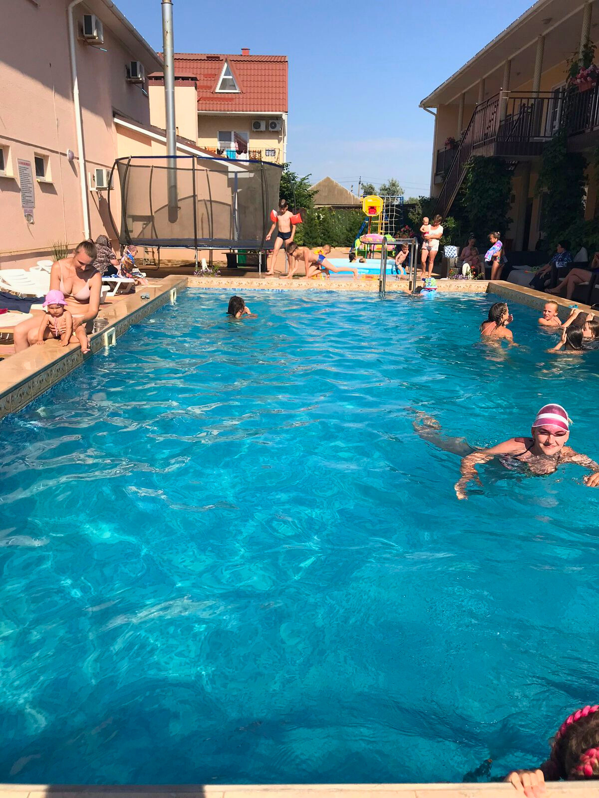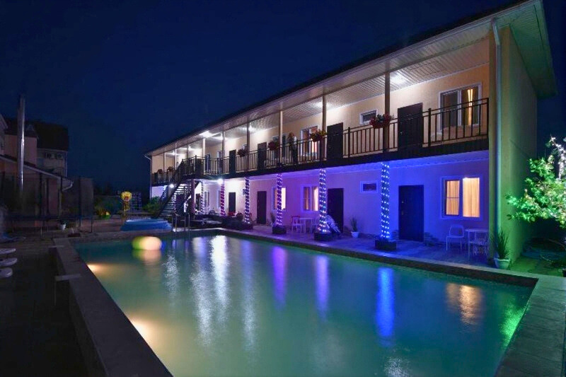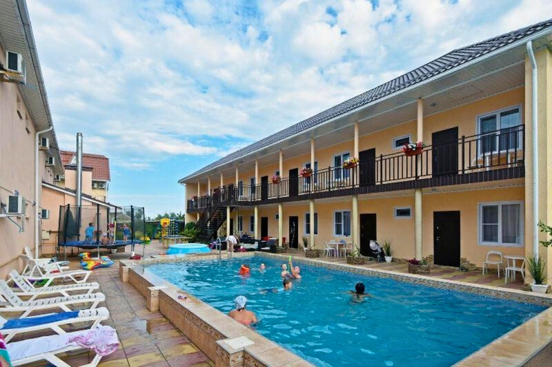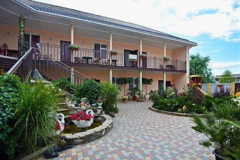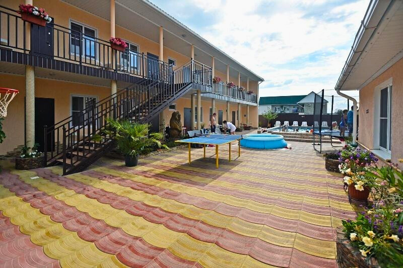 В гостинице: большой благоустроенный двор, оформленный растениями и цветами, альпийская горка с водопадом, стационарный подогреваемый бассейн для взрослых с шезлонгами и креслами для отдыха и надувной бассейн для детей, детская площадка, батут, качель, стол для тенниса, мангал, бесплатный Wi-Fi на территории.