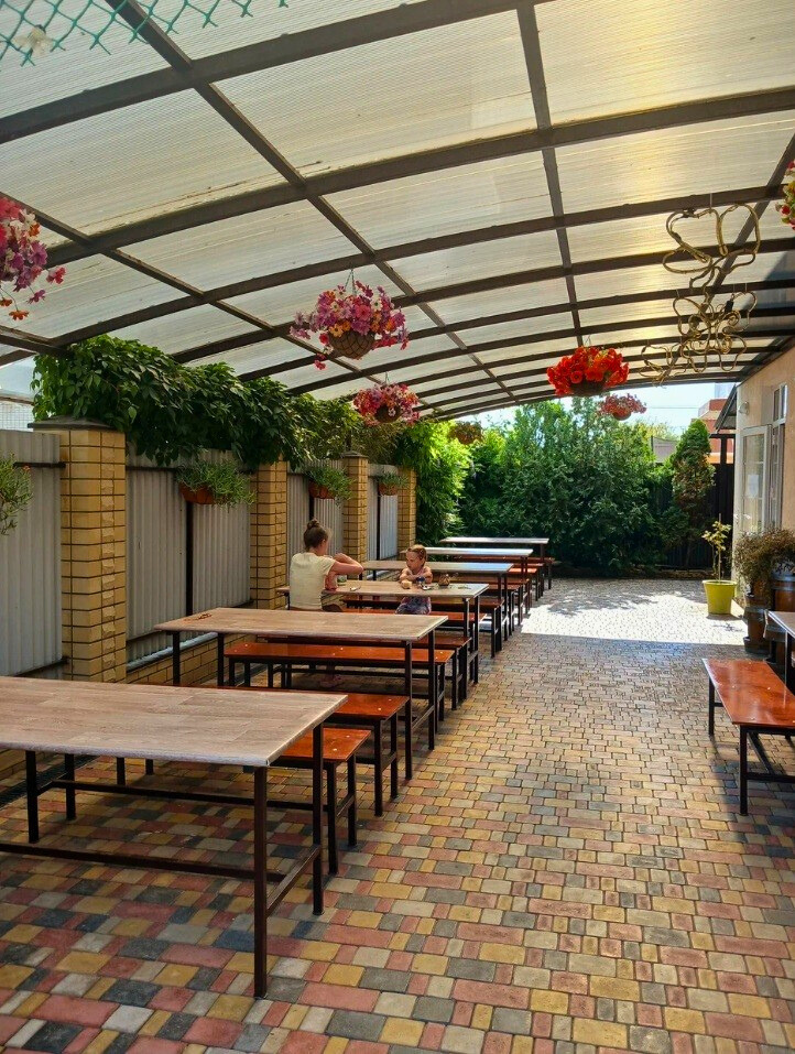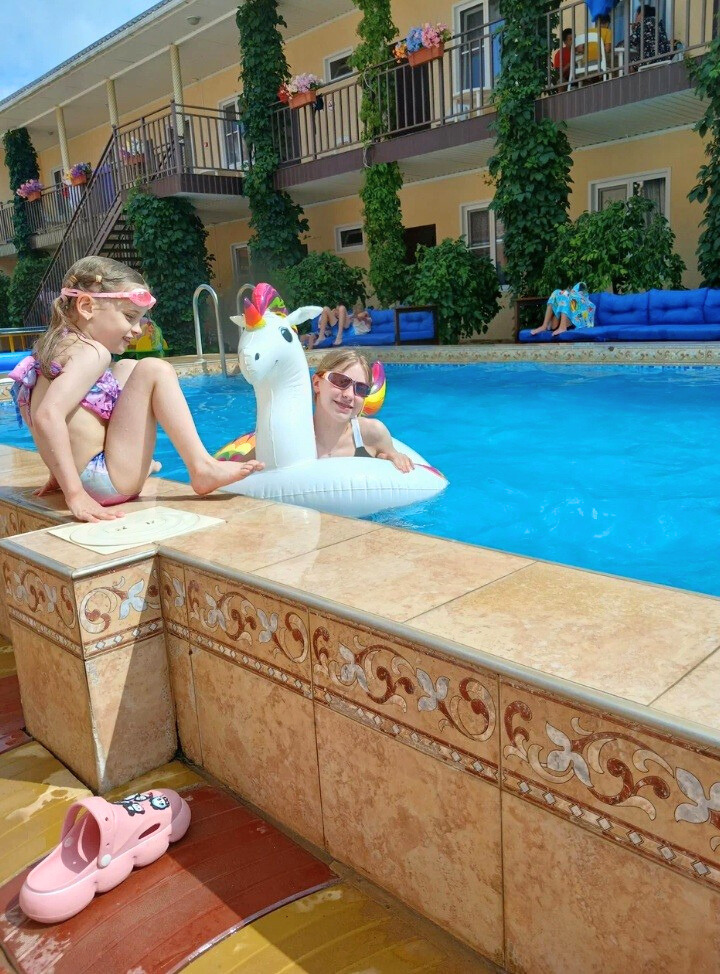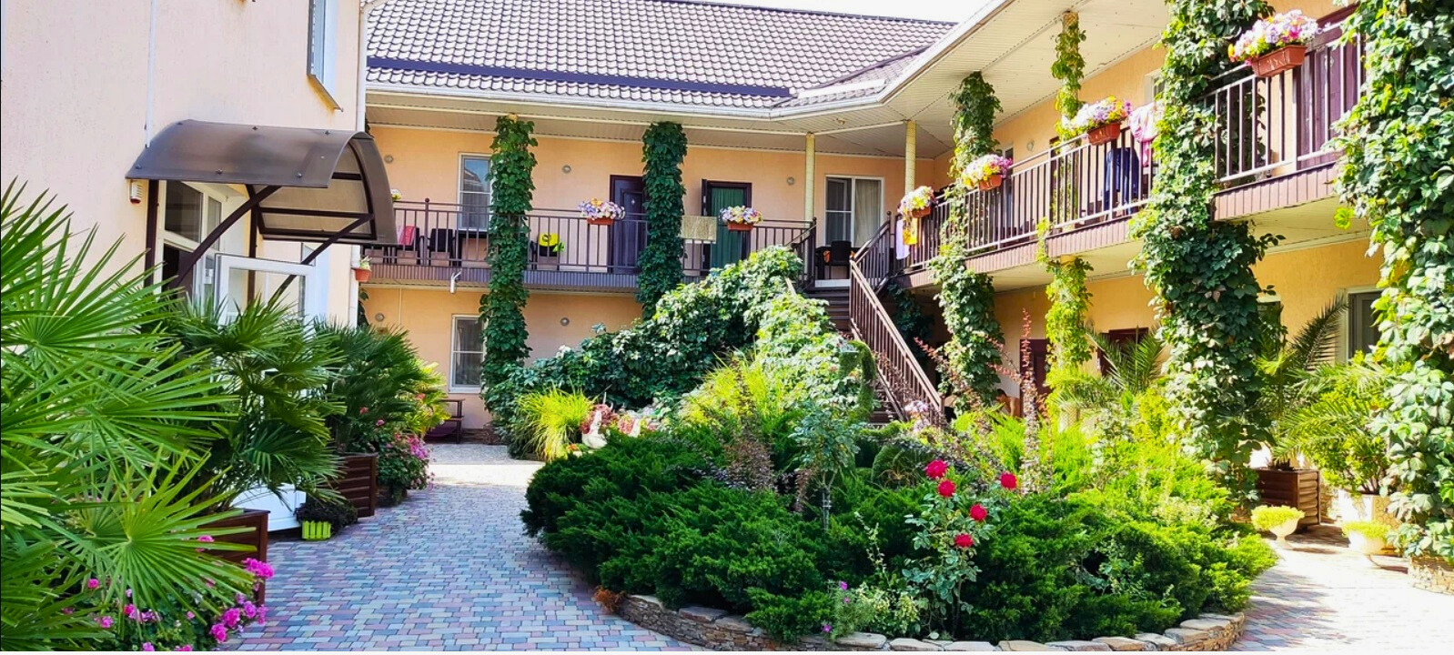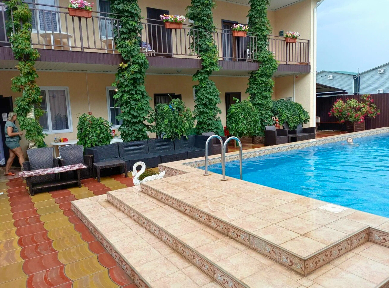 В гостинице: большой благоустроенный двор, оформленный растениями и цветами, альпийская горка с водопадом, стационарный подогреваемый бассейн для взрослых с шезлонгами и креслами для отдыха и надувной бассейн для детей, детская площадка, батут, качель, стол для тенниса, мангал, бесплатный Wi-Fi на территории.