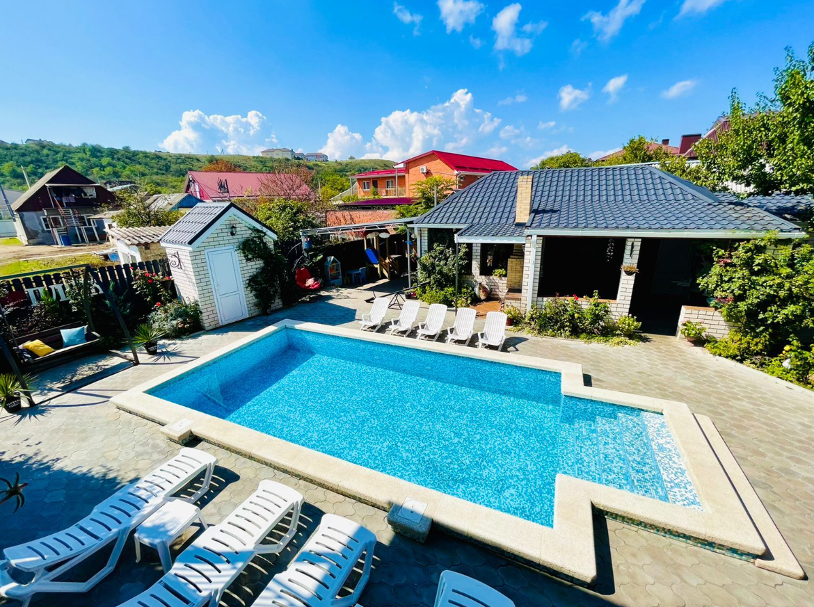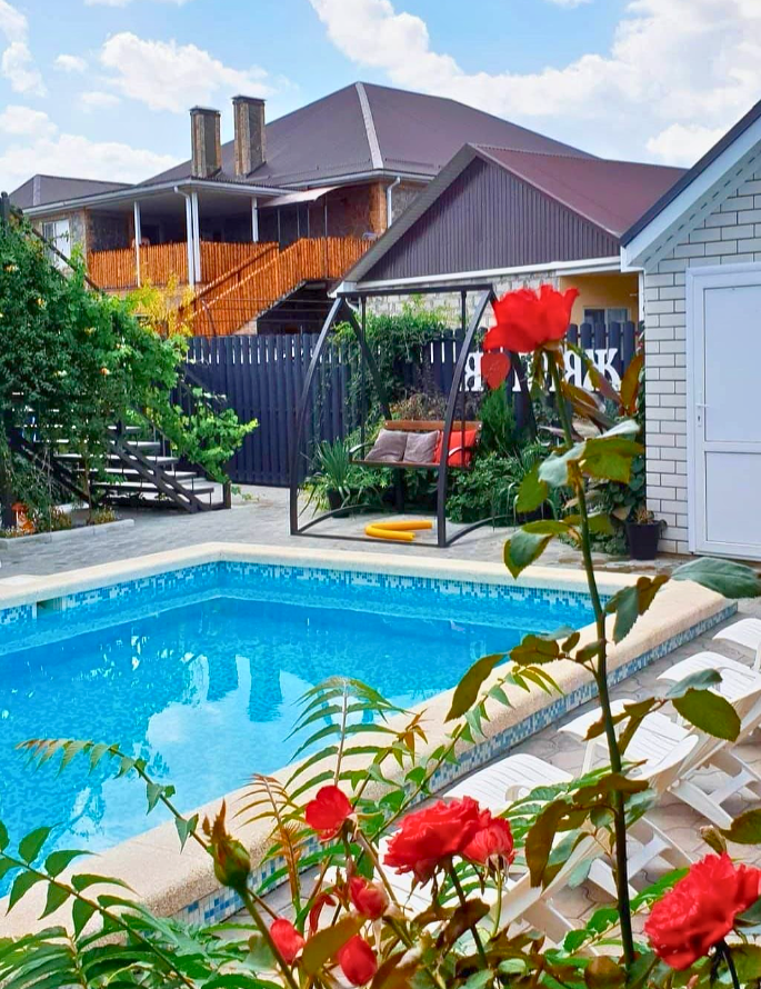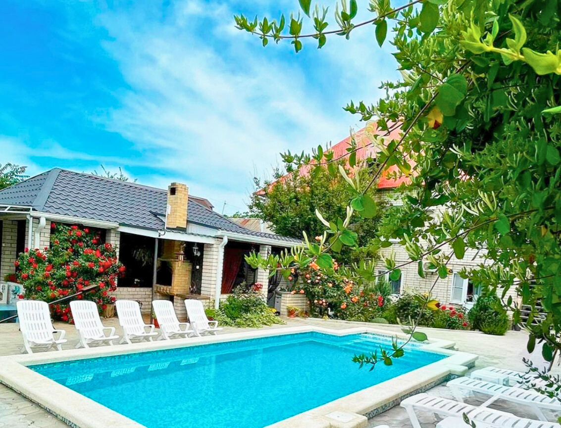 Огромная территория домовладения хорошо благоустроена и озеленена: есть большой бассейн, детская площадка с качелями в тени, большая беседка, стационарный мангал, шезлонги.