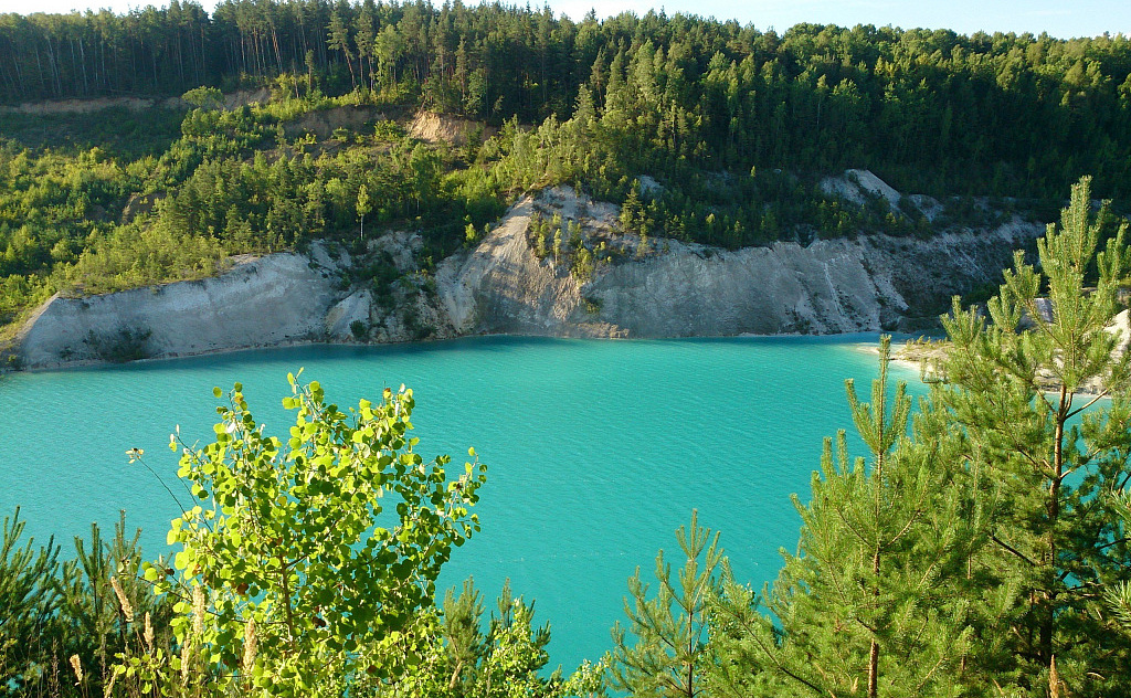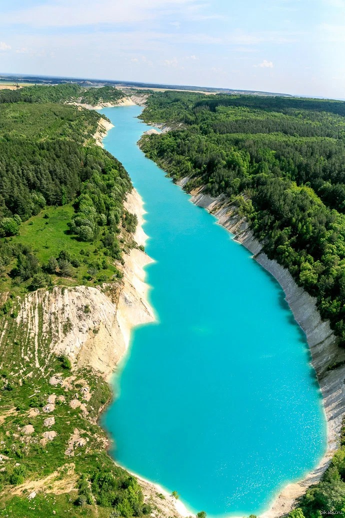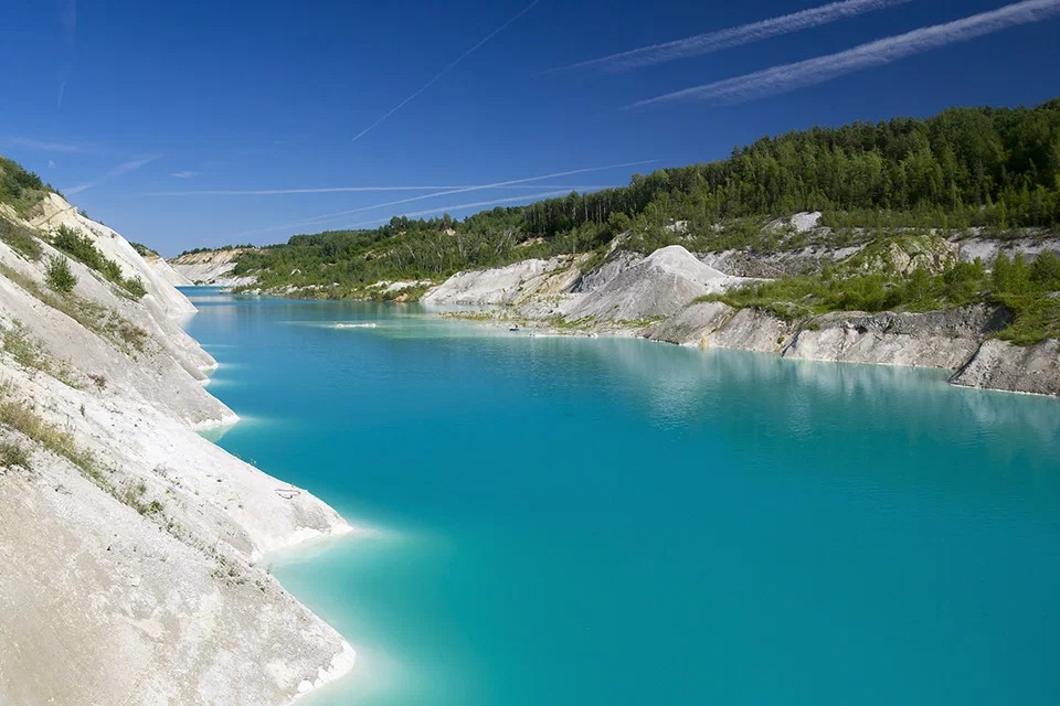 История места: Рассказ о том, как добыча мела привела к образованию этих лазурных озер с высокими обрывистыми берегами.